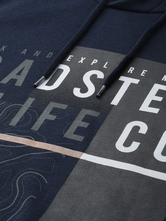 Men Navy Blue & Charcoal Grey Printed Hooded Sweatshirt